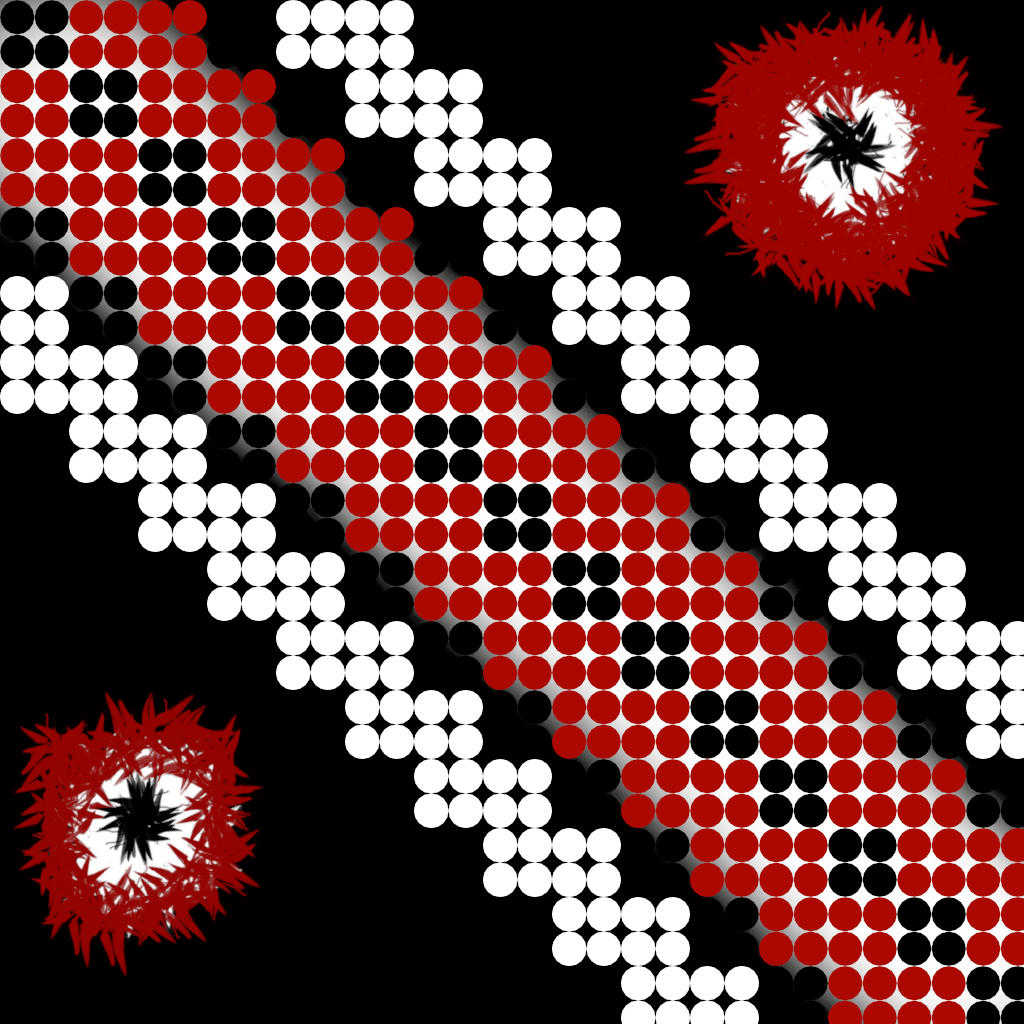 the black cubes,red circles and white stripes
